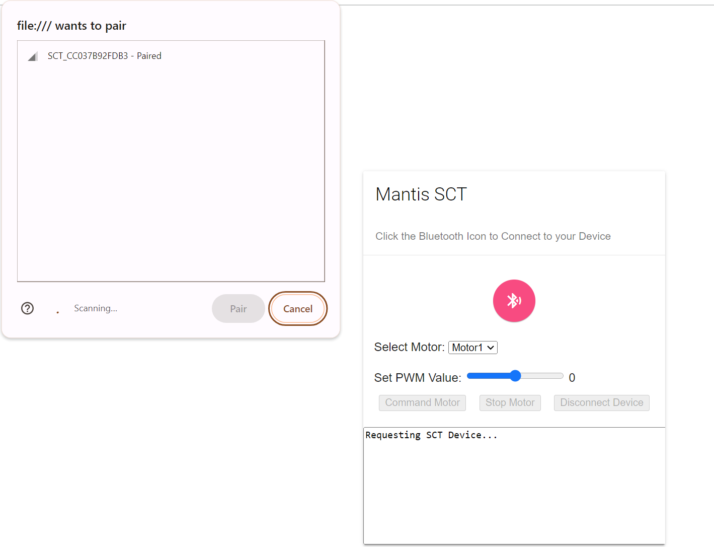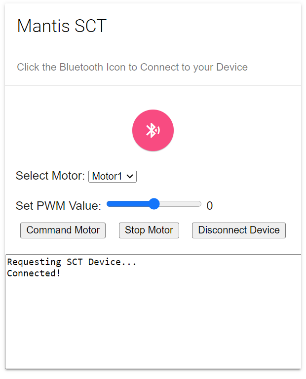 After connecting, use the interface to control the Motors via PWM values set by the slider. Notice how the motors move as your move the commands. Press the Stop Motor command to cease all motion.