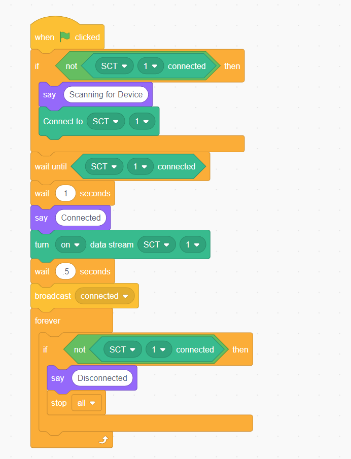 Connecting to any device that’s broadcasting. Once you turn on the device, and press the button to allow connection, pressing the Start button will initiate a command connect with the Scout.
