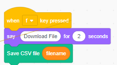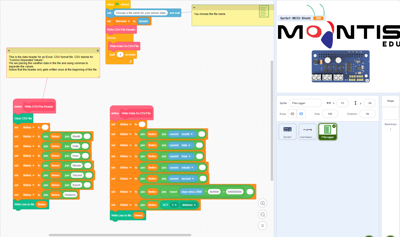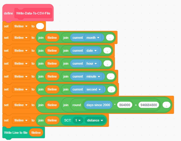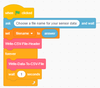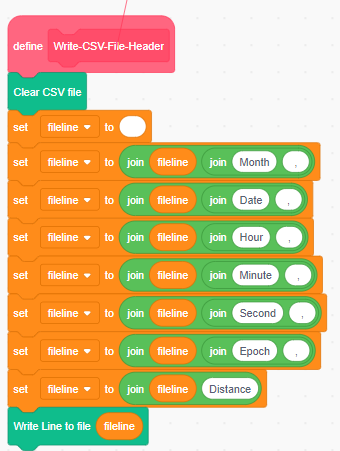 The File logger sprite constructs the CSV File by first writing the header values, using this block of code.