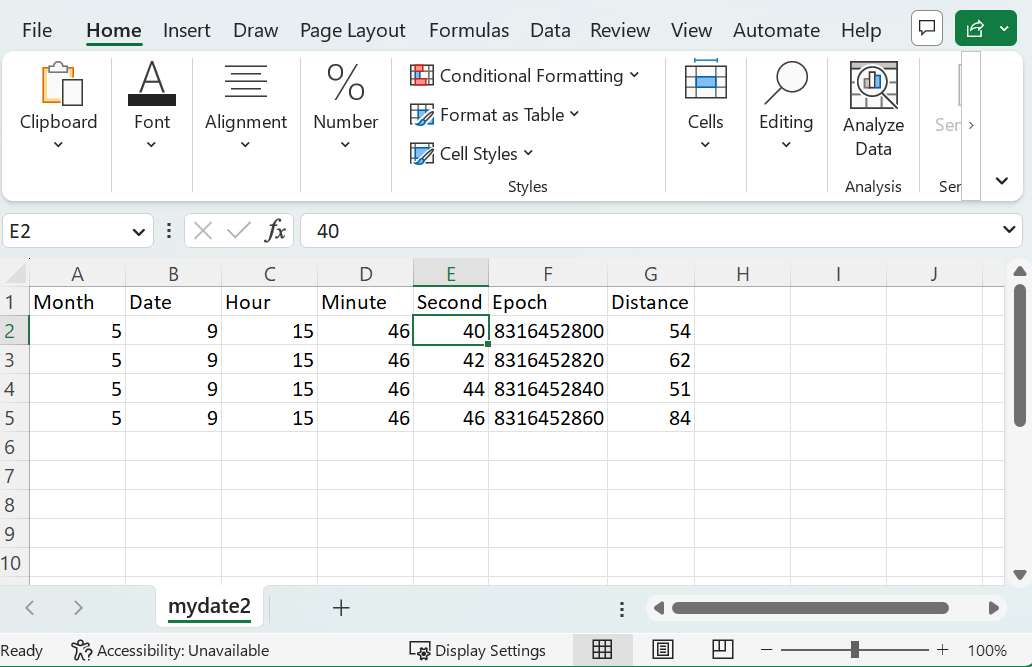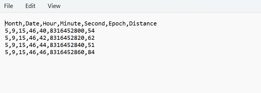 โMonth,Date,Hour,Minute,Second,Epoch,Distanceโ