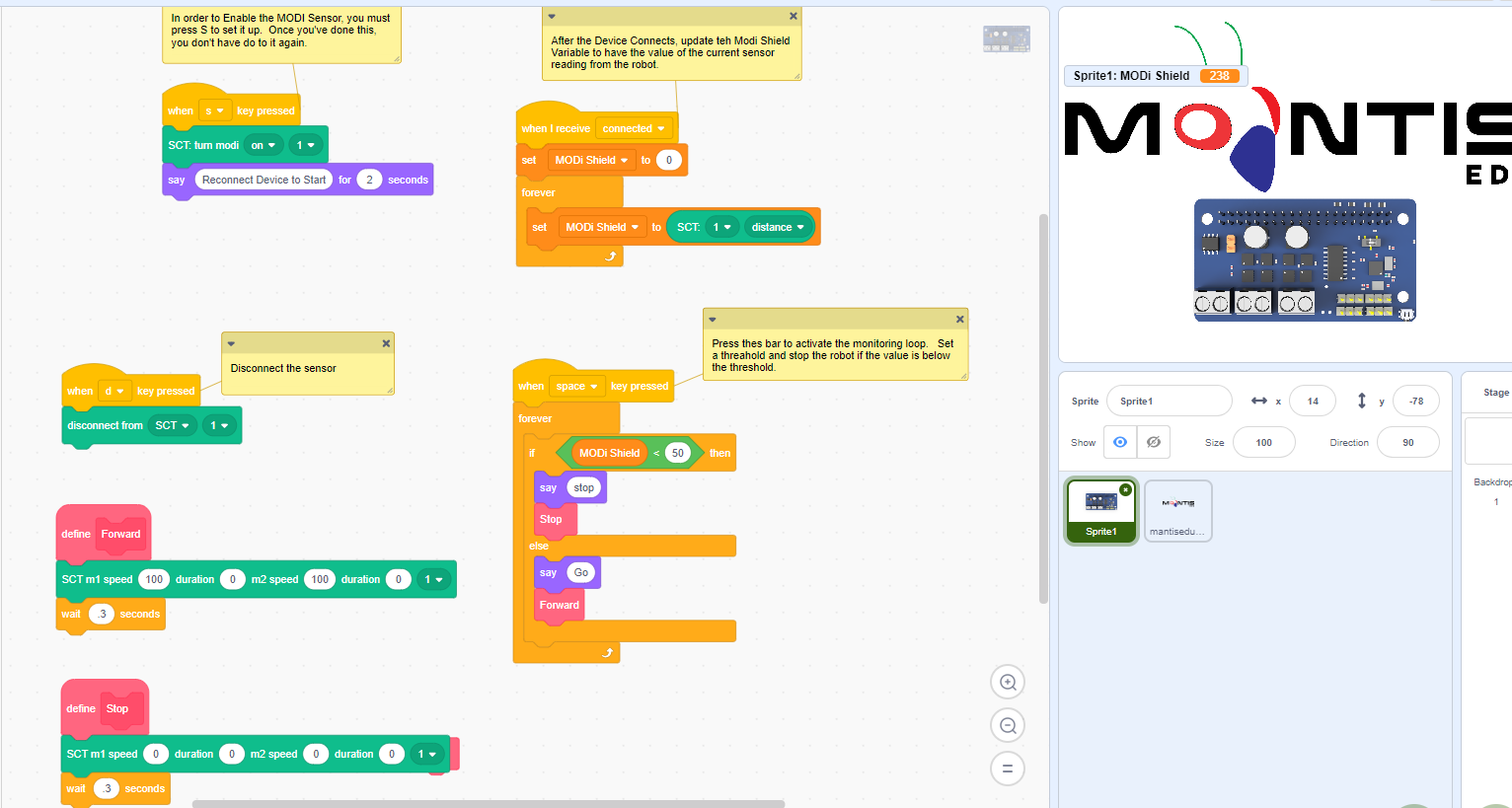 Overall, by combining the distance readings from the MODI sensor with the programming blocks in Scratch, you can create a wide range of movements and behaviors for the Mantis Scout robot.