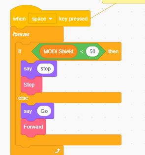 The full example is included below. After connecting and pressing the space bar, the robot will move based on the MODIโs current distance reading.