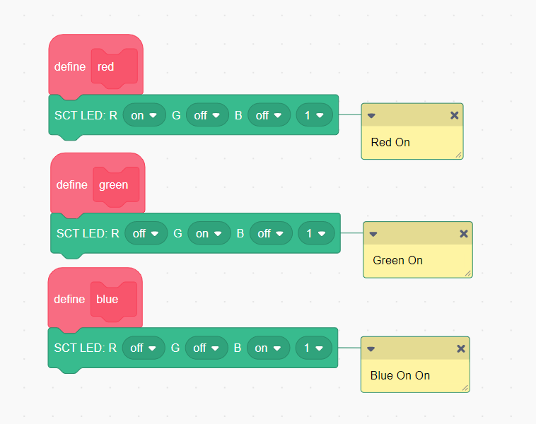 In The example, we have defined three functions that control the state of the LED upon execution. As denoted by their names, they each turn on the LED and set it to the referenced color.