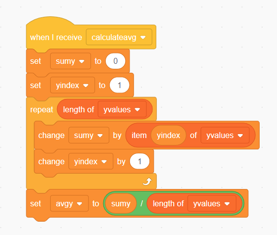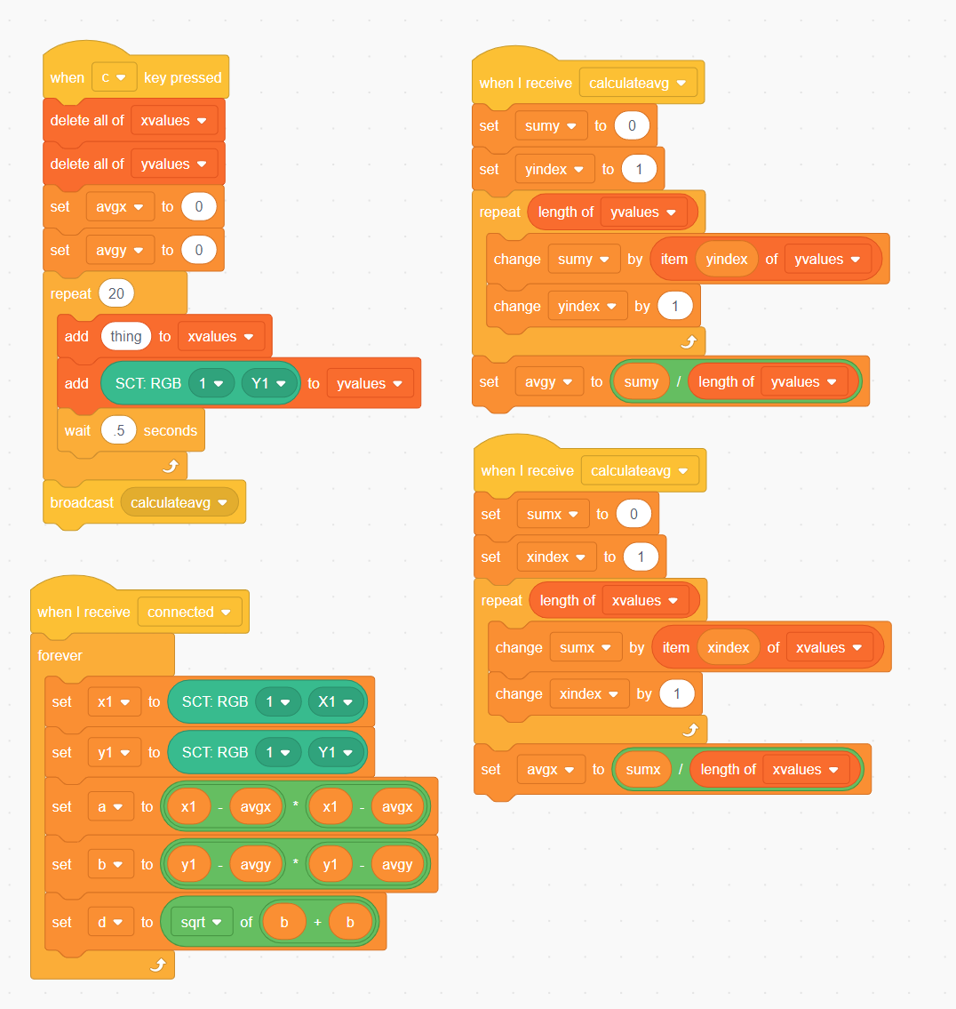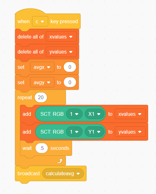For each value, the stored values in the list are summed, and divided by the total number of records. Upon completion, the averages are stored in Avgx and AvgY respectively. The value are a good representation of the expected sensor output when this color is observed.